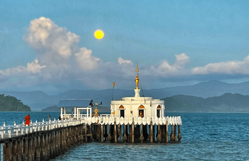 Ko Phayam, une île paisible de Thaïlande, accueillait un festival unique de moines bouddhistes lors de ma visite. Les moines, faute d’hébergements, campaient dans la forêt, ajoutant une ambiance particulière à ce lieu déjà empreint de sérénité. L’île abritait également deux temples remarquables, dont l’un se dressait majestueusement au milieu de la mer. Pour atteindre ce temple, il fallait emprunter une passerelle traversant l’eau, créant une atmosphère magique et apaisante.